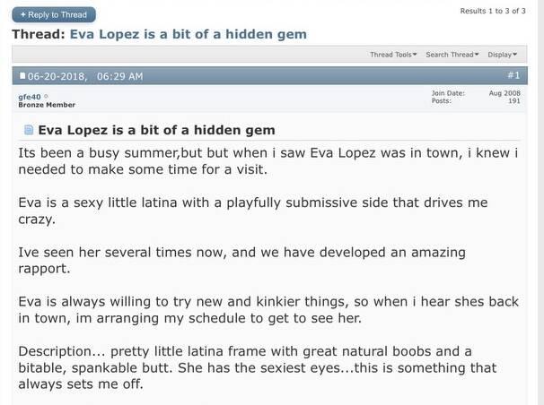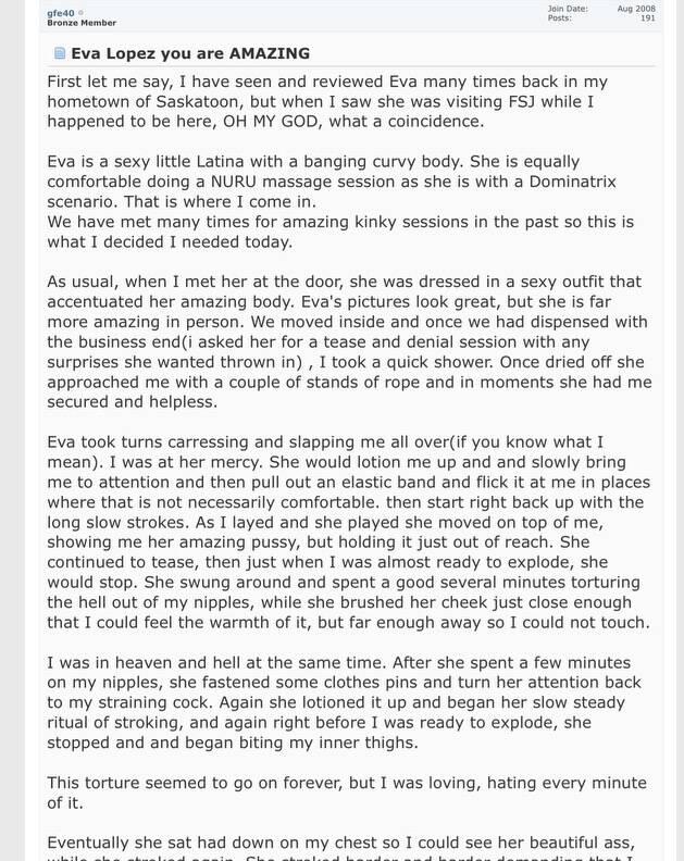 I'm Eva Lopez very sexy and passionate women with a charming personality. During our session, im all yours , I will give you all my attention ,I provide a welcoming atmosphere wiith class and respect. Don't be be shy, I will make you feel comfortable , I most captivating , Im seductive , open minded, & extremely talented, I love to please upscale and polite gentlemen